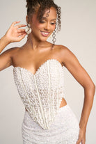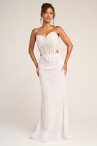 Style PS26326E exudes modern sophistication with its beautifully sculpted design and intricate detailing. The gown features a strapless, sweetheart bodice adorned with delicate pearl and sequin embellishments that shimmer elegantly under the light. The fitted silhouette gracefully contours the body, complemented by soft draping at the waist for a flattering finish. Optional sheer cape sleeves add a touch of drama and movement, perfect for creating a statement entrance. Ideal for formal galas and evening occasions, this gown strikes the perfect balance between timeless refinement and contemporary allure.