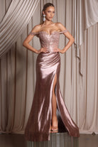 Style PS26334E combines sophistication and allure in a timeless evening silhouette. The gown features a sweetheart neckline embellished with delicate beading that shimmers beautifully under light. A soft draped detail at the waist enhances the figure, while the thigh-high slit adds a touch of modern glamour. Crafted from a lustrous fabric that flows gracefully into a subtle train, this design perfectly balances elegance and confidence??deal for evening galas, formal events, and red-carpet occasions.